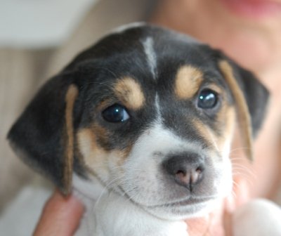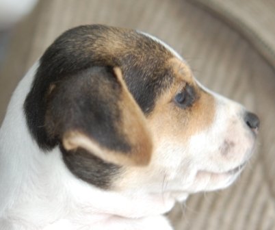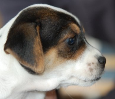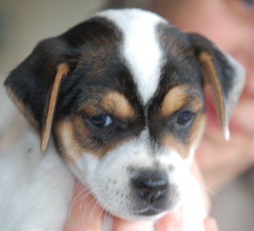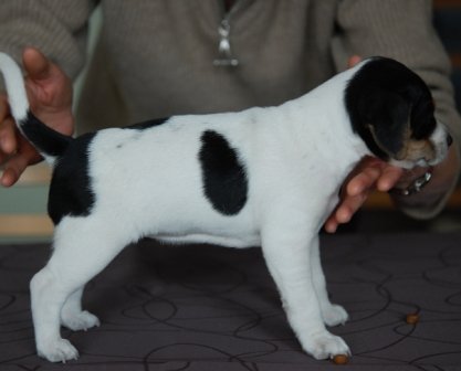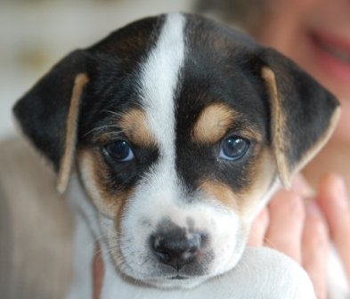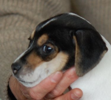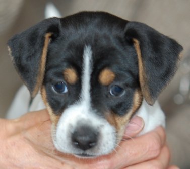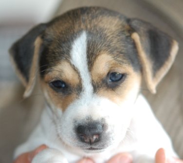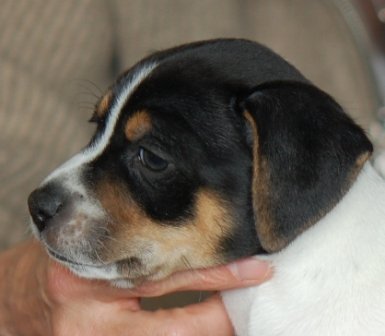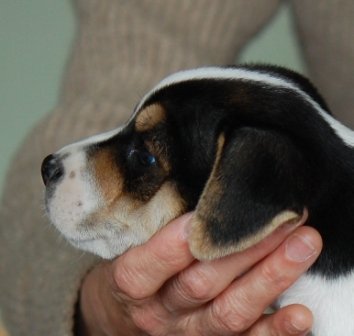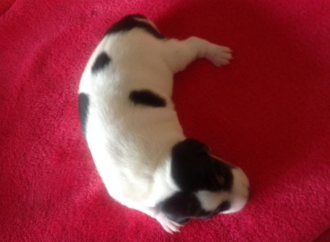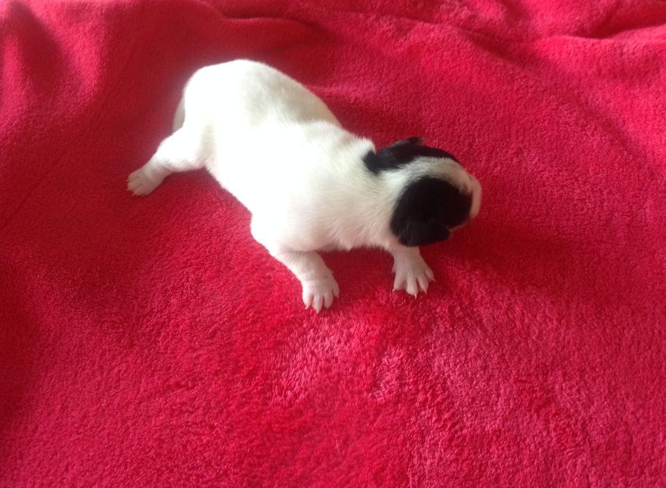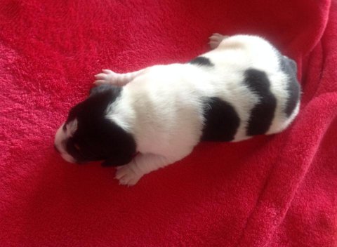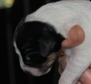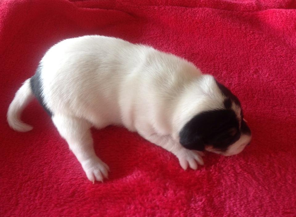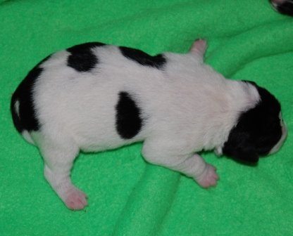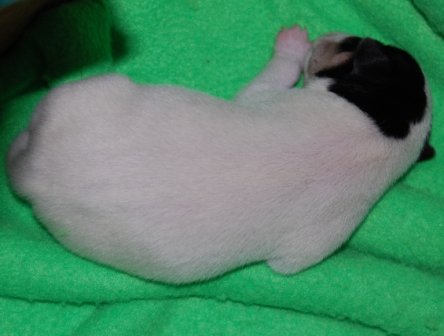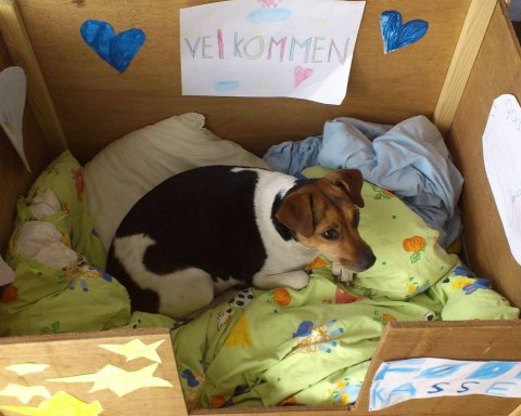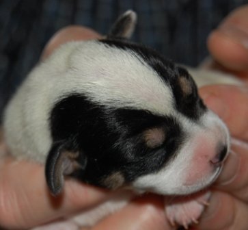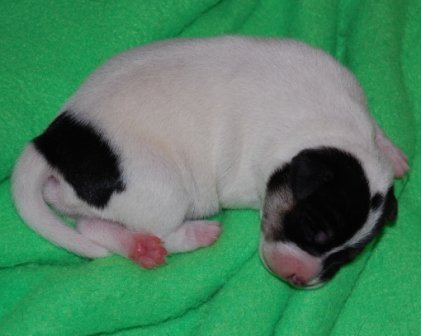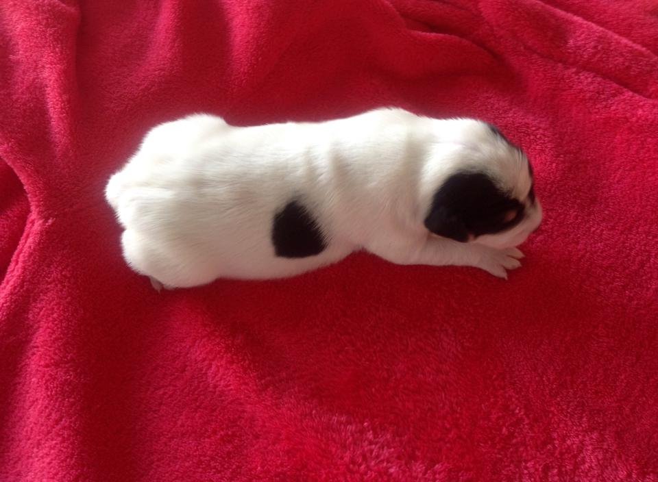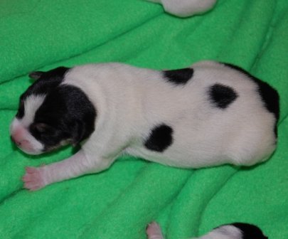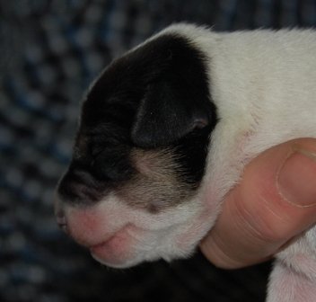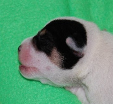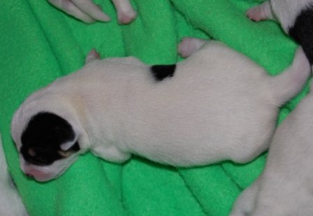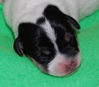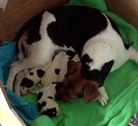 Mille i fødekassen med sine 1 dag gamle hvalpe. 1 han og 4 tæver.