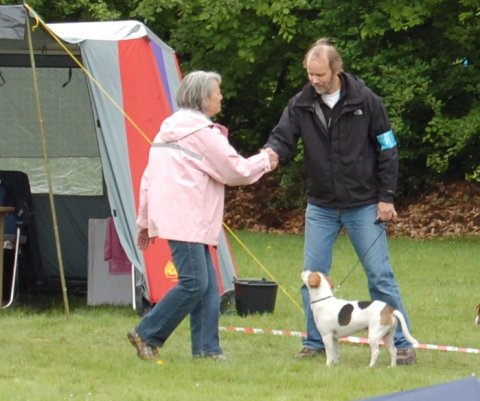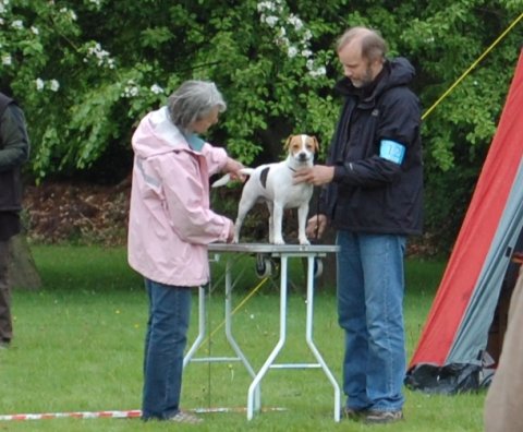 ![]() Jack på dommerbordet. Hillerød 2/5 2010. (Foto: www.jensenklanen.dk ) | ![]() Bjæverskov 24. maj 2010. Jack på dommerbordet. Flemming er i ringen for første gang. | ![]() Jack (og Flemming) vinder Championklassen. Dommer Lisbet Utke Ramsing siger til lykke. |