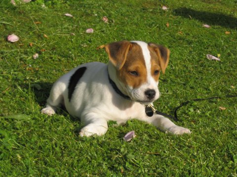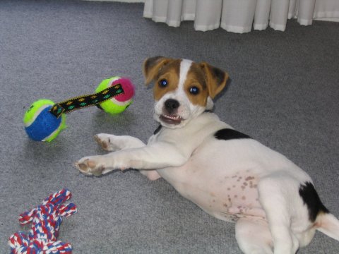 ![]() Jack hjemme i haven på "Godset" | ![]() Det er dejligt at være sommerhvalp | ![]() ca. 10 uger. Leg på gulvet inde i huset |