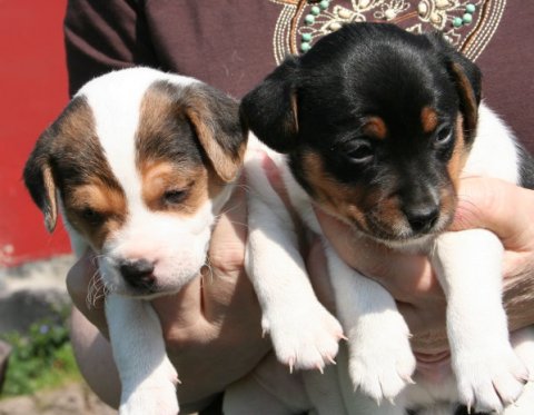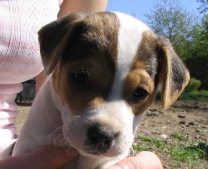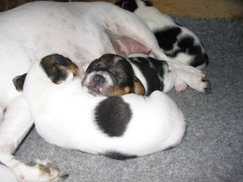 ![]() Jack med ryggen til | ![]() Jack og Dante ca. 7 uger | ![]() Jack 7 uger - hos Louise |